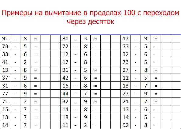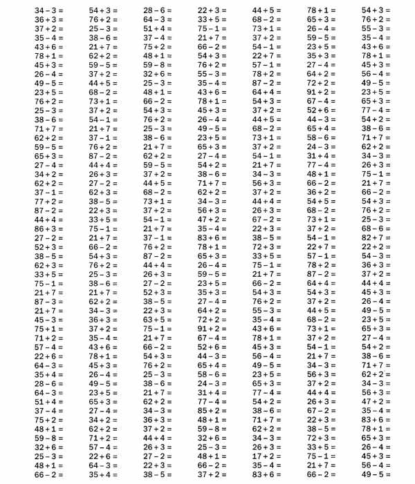 Примеры на сложение и вычитание в пределах 100 распечатать