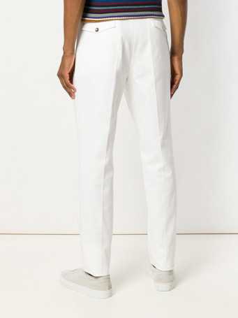 Для летнего образа белые слаксы или бананы с защипами станут удачным приобретением. Мужчины отказываются от светлых брюк, мотивируя это их маркостью. Но белые штаны всегда выделяют мужчину из толпы. Не нужно искать акцентные элементы образа, когда в ансамбле фигурируют белые брюки. С их помощью можно создать интересный летний лук в морском стиле, а также запоминающийся ансамбль на каждый день или для офиса.