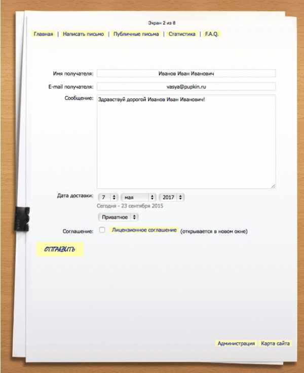 Если вы когда-нибудь хотели напомнить себе о каком-то приятном моменте, дать дельный совет или просто подурачиться, то обязательно попробуйте сервис! Причем, самое интересное то, что дата письма не ограничена. То есть, вам может прийти письмо через неделю, а может и через десятилетие.
