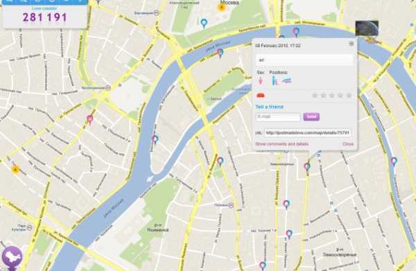 Нет, это не сайт, рекламирующий интим-услуги, не подумайте. Это — необычный сервис на основе Google Maps, позволяющий вам, в некоторой степени, прорекламировать себя. Именно здесь при помощи специального маркера можно отметить на карте те места, где вы занимались любовью. И не просто отметить, но и заполнить информацию о произошедшем, которая будет доступна в виде картинок, либо же добавить комментарий или своё описание событий. Хотите попробовать? Нет ничего проще! Просто кликните по нужному месту мышкой, заполните необходимые поля и известите мир о том, что произошло.