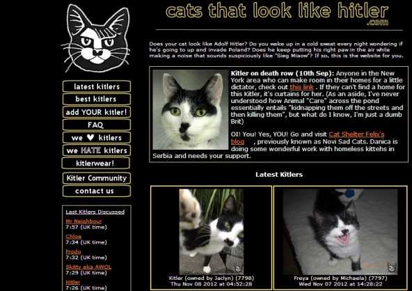 4) Котики. Странных сайтов про котиков, как вы понимаете, тоже очень много. Есть, к примеру, известное хранилище фотографий котов, которые похожи на Гитлера — www.catsthatlooklikehitler.com