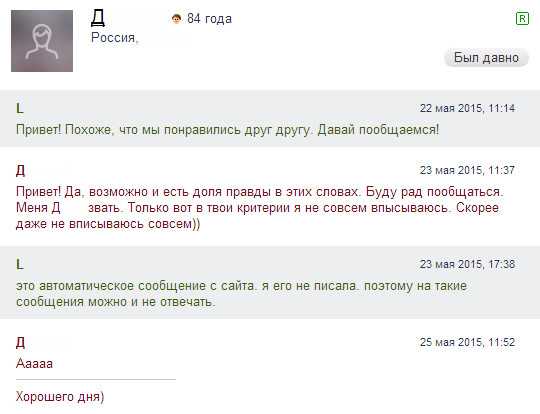 Но нас же интересуют не сами переписки, а их следствие, то есть то, к чему они привели. Не знаю, на сколько свиданий сходила Маша, но у нее очень быстро закрутился роман с женатым мужчиной да так, что она удалила анкету. Я уже писала, что он собирался уходить из семьи, но родственники на него надавили, особенно старший сын, и теперь он живет с женой из чувства долга. Маша разорвала отношения с ним по своей инициативе, хоть ей и было больно, и сейчас опять на сайте.