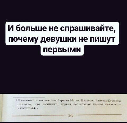 Написала импульсивно, отправила не проверив. А думаю я, увы, не на русском Я хотела бы высказаться по поводу темы «девушка не пишет первой, не зовет гулять, не предлагает встречаться» и т. Совсем недавно я наткнулась на пост, где парень очень осуждал таких барышень, говоря, что если для девушки действительно важен парень, она не должна его бояться.
