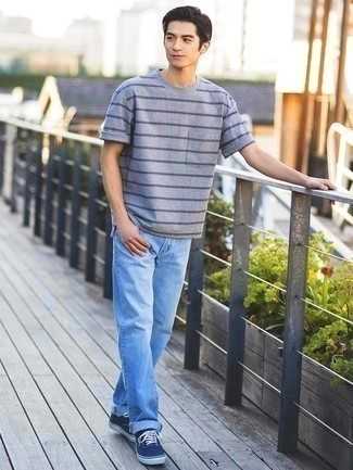 Темно-синие низкие кеды из плотной ткани СохранитьУдалитьЕсли ты делаешь ставку на комфорт и функциональность, серая футболка с круглым вырезом в горизонтальную полоску и голубые джинсы — замечательный вариант для привлекательного мужского ансамбля на каждый день. Если говорить об обуви, темно-синие низкие кеды из плотной ткани являются классным выбором.