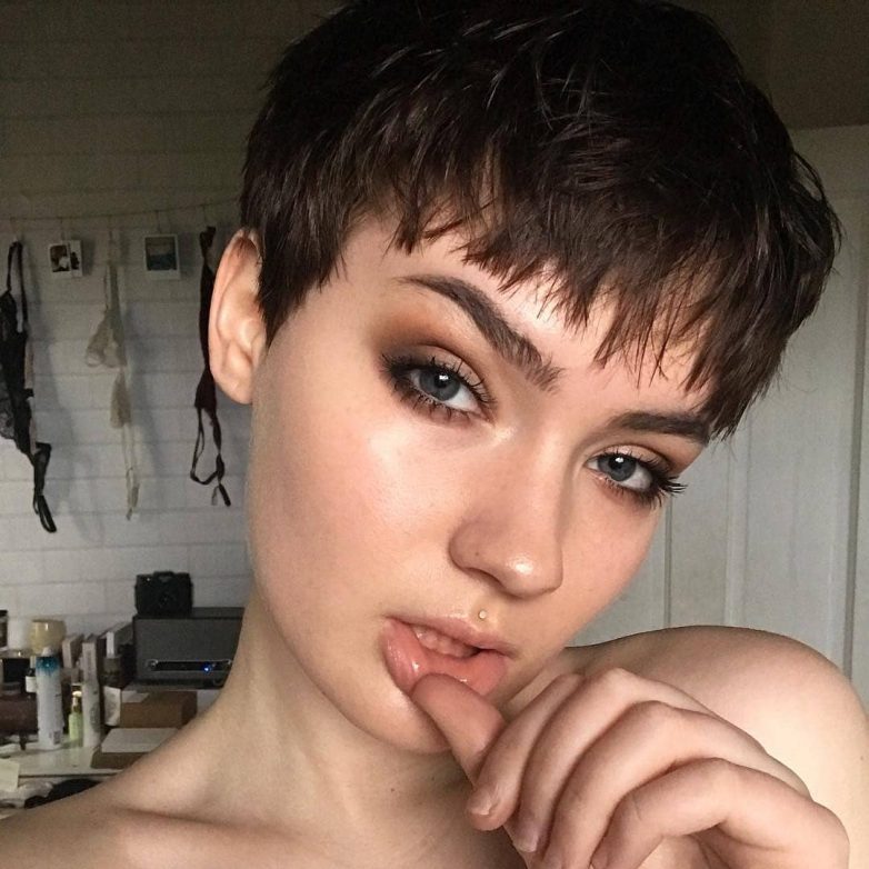 - Эта экстремальная стрижка по сравнению с «ирокезом» выглядит не столь эпатажно, поэтому может подойти и для обычных женщин. Особенно, если они хотят стать смелее, увереннее в себе, облегчить себе жизнь за счет того, что отпадет необходимость частого мытья головы, а также укладок в принципе. На фото – стрижка Ежик: