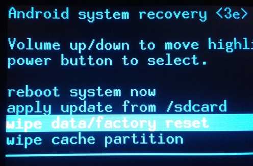 - затем кнопками громкости «больше/меньше» (+/-) выбираем «wipe data/factory reset» и нажимаем на нее кнопкой включения