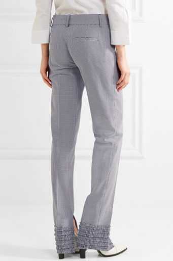 Если хочется выглядеть более лаконично, стоит выбирать брюки с классическими рисунками. Отличным вариантом станут изделия в горох или клетку.