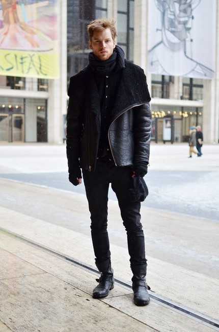 В данное время на пике популярности остаётся куртка косуха. Она плавно перекочевала из осени в зиму, стала более тёплой и объёмной. На картинке снизу представлена именно такая модель. Кожа более плотная, а внутри отделка из натурального меха. Такую куртку удобно сочетать с повседневной одеждой: простыми джинсами, брюками, водолазками и джемперами. Спасаясь от ветра, добавьте вязанный мужской шарф, а перчатки с обрезанными пальцами сделают образ более брутальным и байкерским.