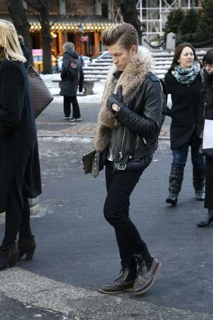 Ещё одна вариация зимней кожаной куртки – куртка с мехом. Мех может быть представлен в качестве воротника, на капюшоне или полностью по всему фасону куртки, кроме рукавов, как на молодом человеке с фото. Мех может быть как натуральным, так и искусственным. В коллекциях сезона осень-зима 2015-2016 дизайнеры использовали большое количество искусственного меха, некоторые из которых являются приверженцами green peace.