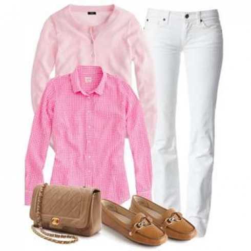 Посмотрите на еще один, не менее продуманный и интересный вариант: здесь классические белые брючки, идеальные для жаркой летней погоды, комбинируются с яркой рубашкой и кардиганом в розовых цветах. Конечно же, светло-коричневые мокасины будут очень уместны в таком женственном и мягком стиле! Подберите сумочку в тон, и образ готов.