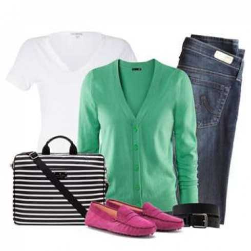 Однако вы можете пойти и от противного: достаточно спокойный и мягкий комплект наряда очень удачно дополнится яркими и запоминающимися мокасинами кричащих цветов. Обратите внимание на этот сиреневый вариант: он отлично сочетается со светло-зеленым кардиганом и черно-белой сумкой в полоску.