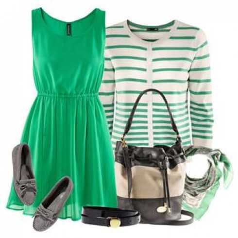 Для романтического свидания отличным выбором станет интересный образ в сочных зеленых тонах: простое хлопковое платье дополните полосатым кардиганом бело-зеленого цвета, и добавьте к этому образу любые мокасины нейтрального цвета.