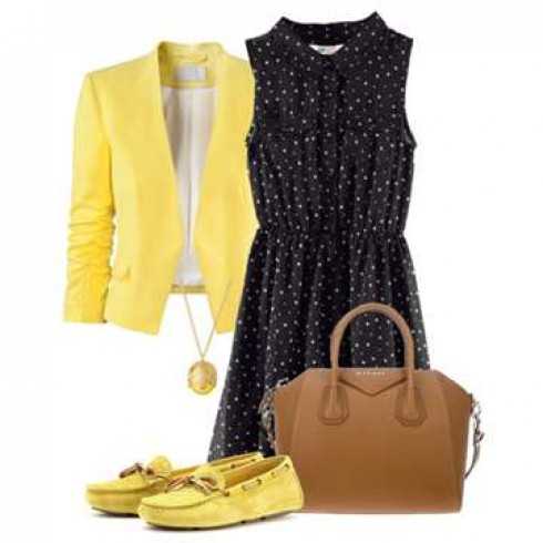 А вот этот вариант, более строгий, может быть уместен и на рабочем месте: темное хлопковое платье в горошек, приталенное с помощью резинки, дополняется ярким пиджаком и мокасинами в тон. Это могут быть любые варианты на ваш выбор: желтый, розовый, зеленый, красный или сиреневый! Главное, чтобы оттенок идеально подходил именно вам.