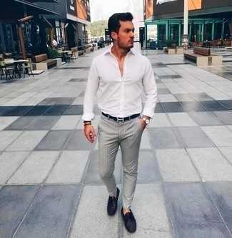 Темно-пурпурные кожаные мокасины СохранитьУдалитьЕсли ты принадлежишь к той редкой группе парней, неплохо разбирающихся в трендах, тебе полюбится лук из белой рубашки с длинным рукавом и серых классических брюк в вертикальную полоску. Подбирая обувь, можно немного поэкспериментировать и дополнить лук мокасинами.