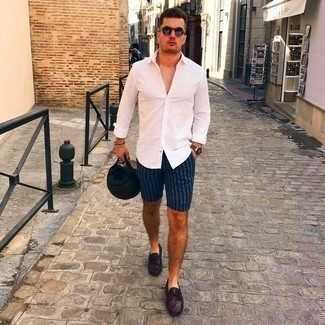 Темно-пурпурные кожаные мокасины СохранитьУдалитьБелая рубашка с длинным рукавом и темно-синие шорты в вертикальную полоску будут прекрасно смотреться в стильном гардеробе самых требовательных молодых людей. В паре с этим луком гармонично будут смотреться мокасины.