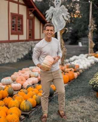 Коричневые кожаные мокасины СохранитьУдалитьБежевый свитер с круглым вырезом и светло-коричневые брюки чинос будет прекрасной идеей для расслабленного ансамбля на каждый день. Мокасины станут прекрасным дополнением к твоему луку.