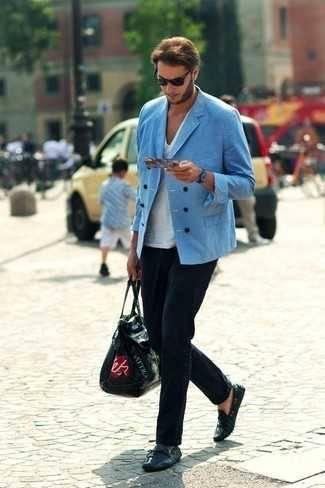 Черные кожаные мокасины СохранитьУдалитьНесмотря на то, что этот лук выглядит довольно-таки сдержанно, лук из синего двубортного пиджака и черных классических брюк приходится по вкусу стильным мужчинам, непременно покоряя при этом сердца барышень. Чтобы добавить в образ немного легкой небрежности , на ноги можно надеть мокасины.