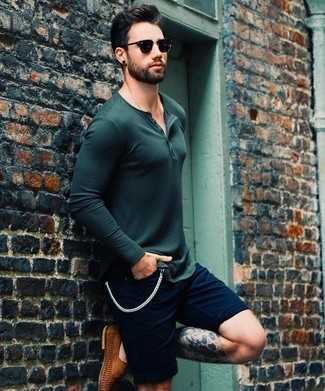 Бежевые кожаные мокасины СохранитьУдалитьСветло-коричневый свитер с v-образным вырезом и темно-синие шорты — хороший образ для похода в кино или марафона по городским барам. Мокасины — великолепный вариант, чтобы закончить лук.