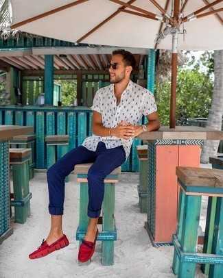 Темно-пурпурные кожаные мокасины СохранитьУдалитьЕсли ты запланировал сумасшедший день, сочетание темно-синей рубашки с длинным рукавом и синих рваных зауженных джинсов поможет создать комфортный ансамбль в непринужденном стиле. В паре с мокасинами такой образ смотрится особенно выигрышно.