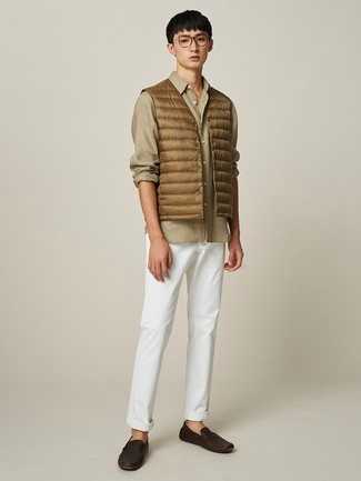 Темно-коричневые кожаные мокасины СохранитьУдалитьСветло-коричневая куртка без рукавов и белые брюки чинос прочно обосновались в гардеробе многих парней, помогая создавать незаезженные и практичные луки. В тандеме с этим ансамблем наиболее выгодно будут выглядеть мокасины.