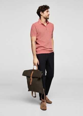 Светло-коричневые замшевые мокасины СохранитьУдалитьРозовая футболка-поло и черные брюки чинос без сомнений украсят гардероб любого молодого человека. Очень недурно здесь смотрятся мокасины.