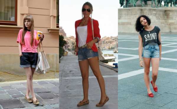 Джинсовые шорты и мокасины словно созданы друг для друга. Одежда из натуральной ткани и обувь из настоящей кожи понравится любительницам путешествий, приключений и здорового образа жизни. Обычно шорты из денима выпускаются довольно короткими, поэтому откажитесь от такого наряда, даже если вам он очень нравится, если у вас ноги короткие и полные. Но, если фигура позволяет, шорты можно комбинировать с майкой, топом или рубашкой. А в мягких и удобных мокасинах можно проводить хоть весь день, не испытывая дискомфорта. Кстати, их носят либо на босую ногу, либо поверх укороченных носков. Но, в отличие от кроссовок или кед, носки из мокасин выглядывать не должны.
