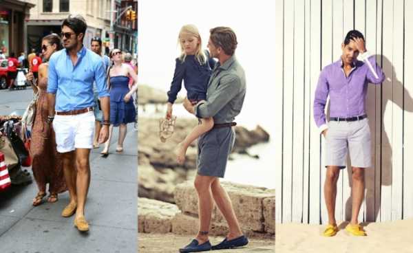 Считается, что мокасины к шортам не подходят, но это не так. Просто нужно грамотно подбирать весь наряд. Для городского стиля прекрасным решение станут шорты классического кроя длиной до колена с контрастного цвета ремнём, и заправленная в них рубашка. Удачно смотрится верх из лёгких тканей с длинным рукавом, завёрнутым до локтя. Что касается длины шорт, то оптимальный вариант — это длина до колена. В этом случае фигура невысоких мужчин не будет смотреться непропорционально. Длину выше колена могут позволить только высокие парни с относительно стройными ногами без явных изъянов. Следует учесть, что такая длина подчёркивает косолапость и кривизну ног, а мокасины с укороченными носками подчёркивают это ещё больше. Как городской вариант одежды такое сочетание является идеальным.