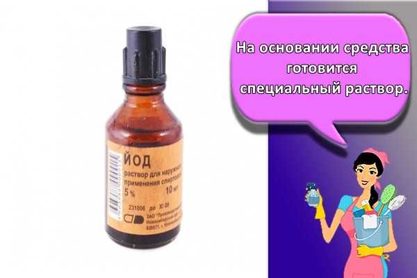 На основании средства готовится специальный раствор. В 1 л воде растворяется 20 капель йода. После протирания внутренней части обуви мыльной водой она обрабатывается ватным диском, смоченным в йодном растворе.