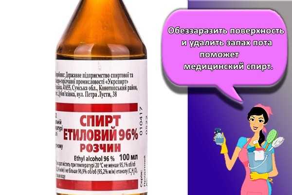 Обеззаразить поверхность и удалить запах пота поможет медицинский спирт. Выбирается один из двух вариантов применения. Спирт заливается в туфли или сапоги, а на ноги надеваются носки. Человек должен быть обутым до тех пор, пока спирт полностью не испарится.