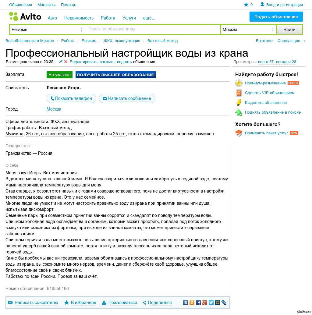 Avito отличается тем, что здесь много тех, кто ищет подработку, а также желающих работать «сдельно». Они размещают резюме, но указывают разовую оплату за свои услуги. Поэтому, если вам нужно найти маляра, чтобы покрасить офис, или бухгалтера на аутсорсинг, Avito – вполне подходящая для этого площадка. Соискателей привлекает и то, что можно «продвигать» свое резюме, как и все другие объявления: выделять, поднимать в поиске, помещать в VIP блоке. Этот момент косвенно показывает работодателю, насколько человек заинтересован в работе.