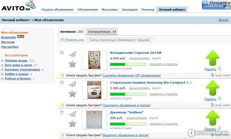 Теперь у вас есть возможность войти в свой «Личный кабинет». Это своего рода имя профиля на сайте. Нажмите на надпись в правом верхнем углу (или на свое имя). Откроется страница, в центре которой будут опубликованы все ваши активные объявления.