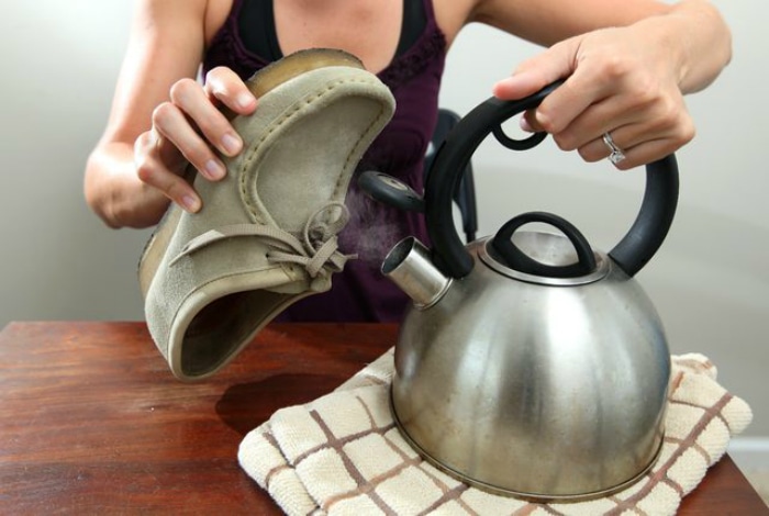 - После того как крупные кристаллы соли были убраны с ботинок, их нужно отпарить. Поставьте чайник на огонь и дождитесь, пока вода закипит. Поднесите к носику чайника ботинки и подержите их некоторое время для того, чтобы они обработались паром;