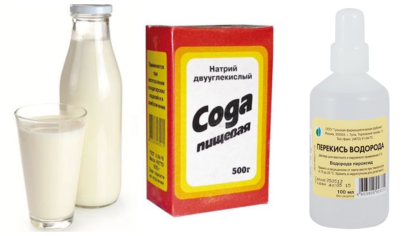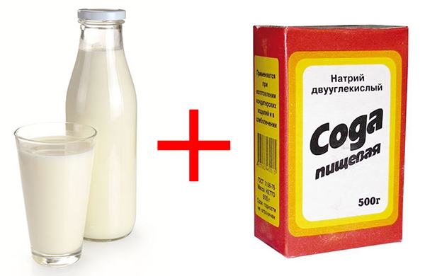 - В любую емкость налейте 100 миллилитров молока и добавьте в него ложку пищевой соды;