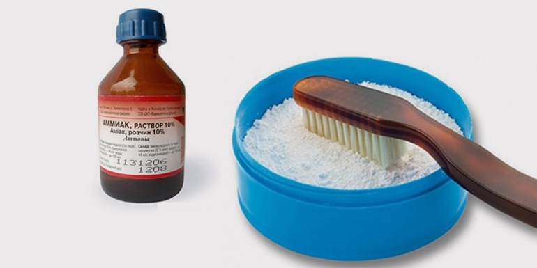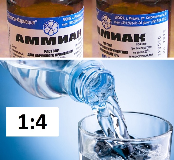 - Подготовьте 100% нашатырный спирт и 1 литр отфильтрованной воды. Смешайте в пропорциях 1 к 4;