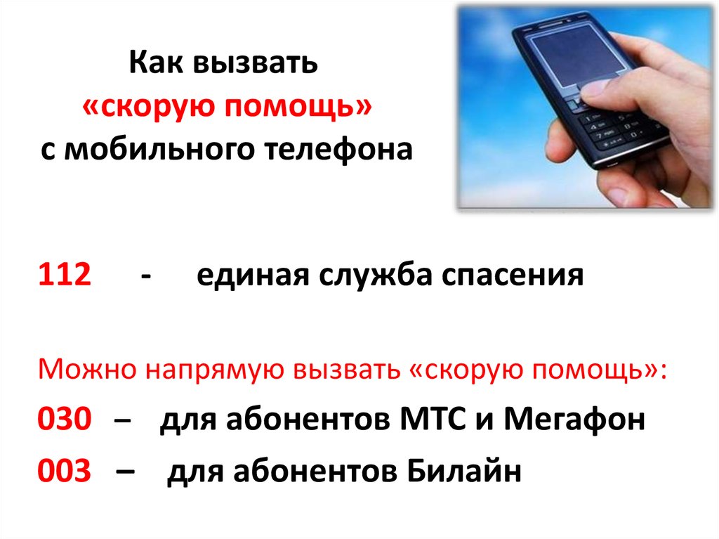 Чтобы набрать номер и вызвать полицию или скорую, как с мобильного телефона, так и с городского, используется дополнительная единица в начале номера для привычных номеров 01, 02, 03 и 04 для любого оператора — МегаФон, МТС, Билайн или других.