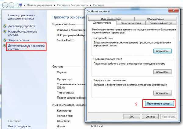 - Вам понадобится раздел «Дополнительные параметры системы», где во вкладке «Дополнительно» следует щелкнуть по кнопке «Переменные среды».
