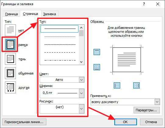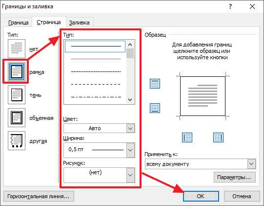 - Далее в новом окне стоит настроить параметры отображения. Сначала слева указываем тип «Рамка», затем в средней колонке можем указать разновидность линии (сплошная, прерывистая, точечная и т.д.), цвет (по умолчанию – черный), ширину (толщину) и даже графическое оформление (с узором). Справа можно указать – с какой стороны наносить рамку: сверху, снизу, по бокам или вокруг: