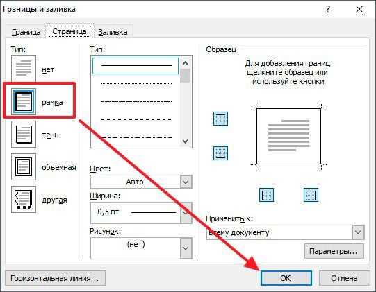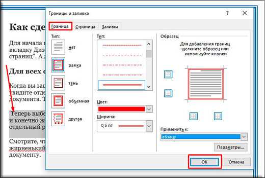 После этого появится окно «Границы и заливка». Здесь нужно выбрать рамку и нажать на кнопку «Ok». После этого каждая страница документа будет обрамлена рамкой.
