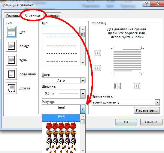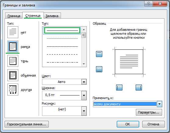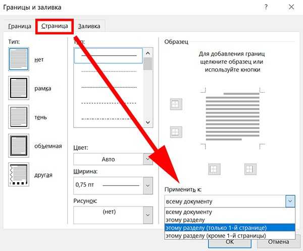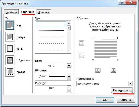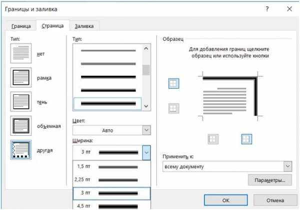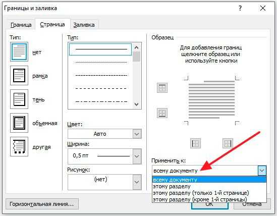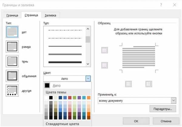 Рис. №2 Границы и заливки.Совет: по умолчанию, границы применяются ко всему документу, что означает, что каждая страница будет иметь те же границы. Нажав на стрелку вниз на «Применить к» даст вам возможность выбрать где будет располагаться рамка только на первая страница, на всех страницах или на всех страницах кроме первой.
