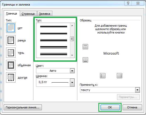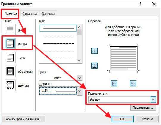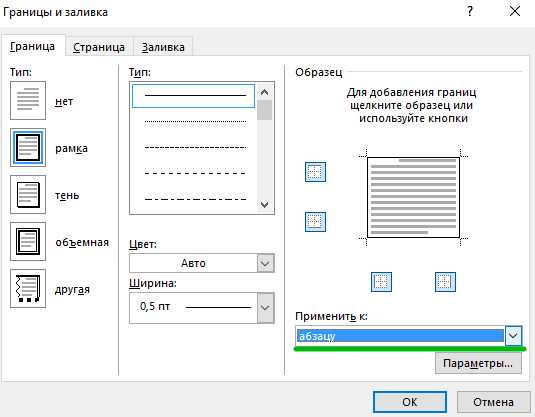 Выбираем тип, толщину, цвет рамки. В пункте «Применить к» выбираем «Абзац».