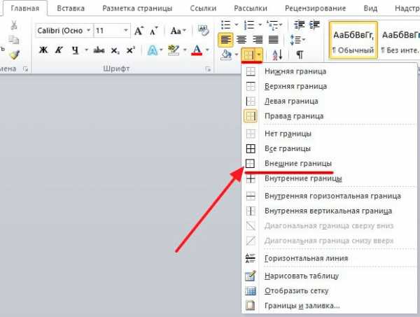 На вкладке «Главная» щелкните стрелку вниз на границе, чтобы получить параметры, границы, как показано на рисунке снизу.