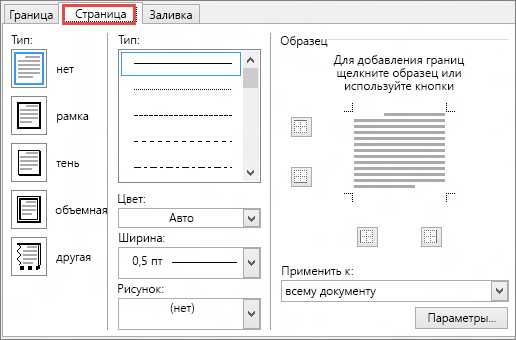 Так же, как и в предыдущем способе вам нужно перейти в меню: Главная –> Границы –> Границы и заливка, затем открыть вкладку Страница. Здесь расположены настройки для рамок, которые будут применены на всех страницах.