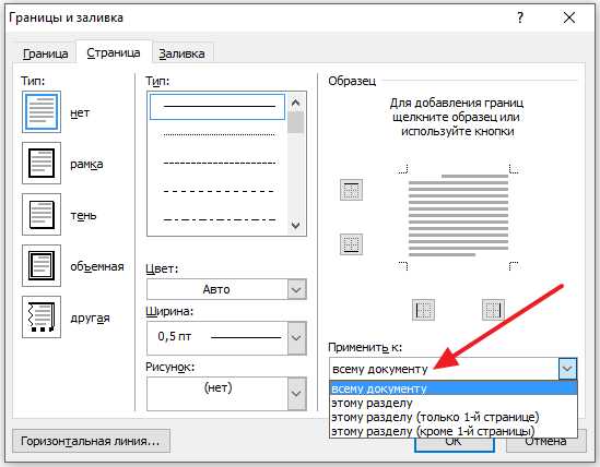 Чтобы сделать рамку в Ворде на всех страницах нужно в параметре «Применить к» выбрать пункт «