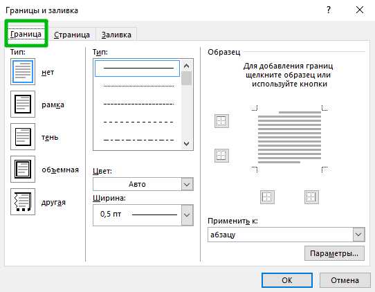 Если вам не нужно сделать рамку вокруг всей страницы, то вы можете сделать ее вокруг выбранного вами абзаца текста. Для этого установите курсор на тот абзац, вокруг которого вы хотите сделать рамку, нажмите на кнопку «Границы страниц» и перейдите на вкладку «Граница».