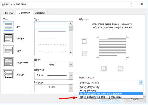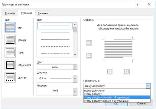 Чтобы проставить рамку только на титульном листе, нужно указать ее параметры, как это было описано ранее, а затем выбрать «Применить к» — «Этому разделу (только 1-й странице)».