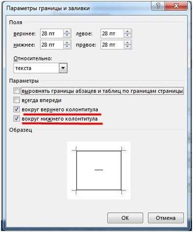 Можно настроить совмещение с колонтитулами. Если установлены галочки «Вокруг верхнего/нижнего колонтитула», то отступ будет рассчитан от колонтитула.