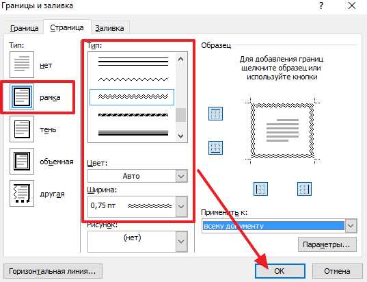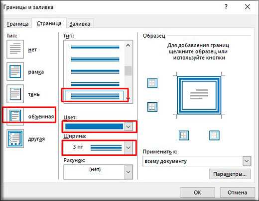 MS Word позволяет менять тип рамки, ее ширину, цвет и заливку. Также возможно оформить рамку в виде рисунка.