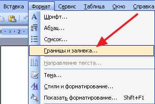 В Word 2003 выбираем «Формат» — «Границы и заливка». Если этого пункта нет, то следует отобразить список полностью, нажав на кнопку в виде двух стрелок.