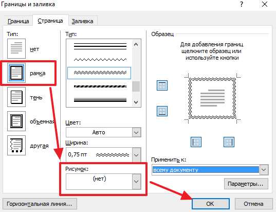 При необходимости, в качестве узора рамки можно выбрать один из предложенных Word рисунков. Для этого нужно выбрать тип оформления «Рамка» и вариант рисунка. После чего нужно сохранить настройки.