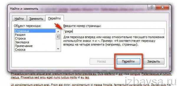 4. В дополнительном окне «Найти и заменить», на вкладке «Перейти», выберите объект перехода «Страница».